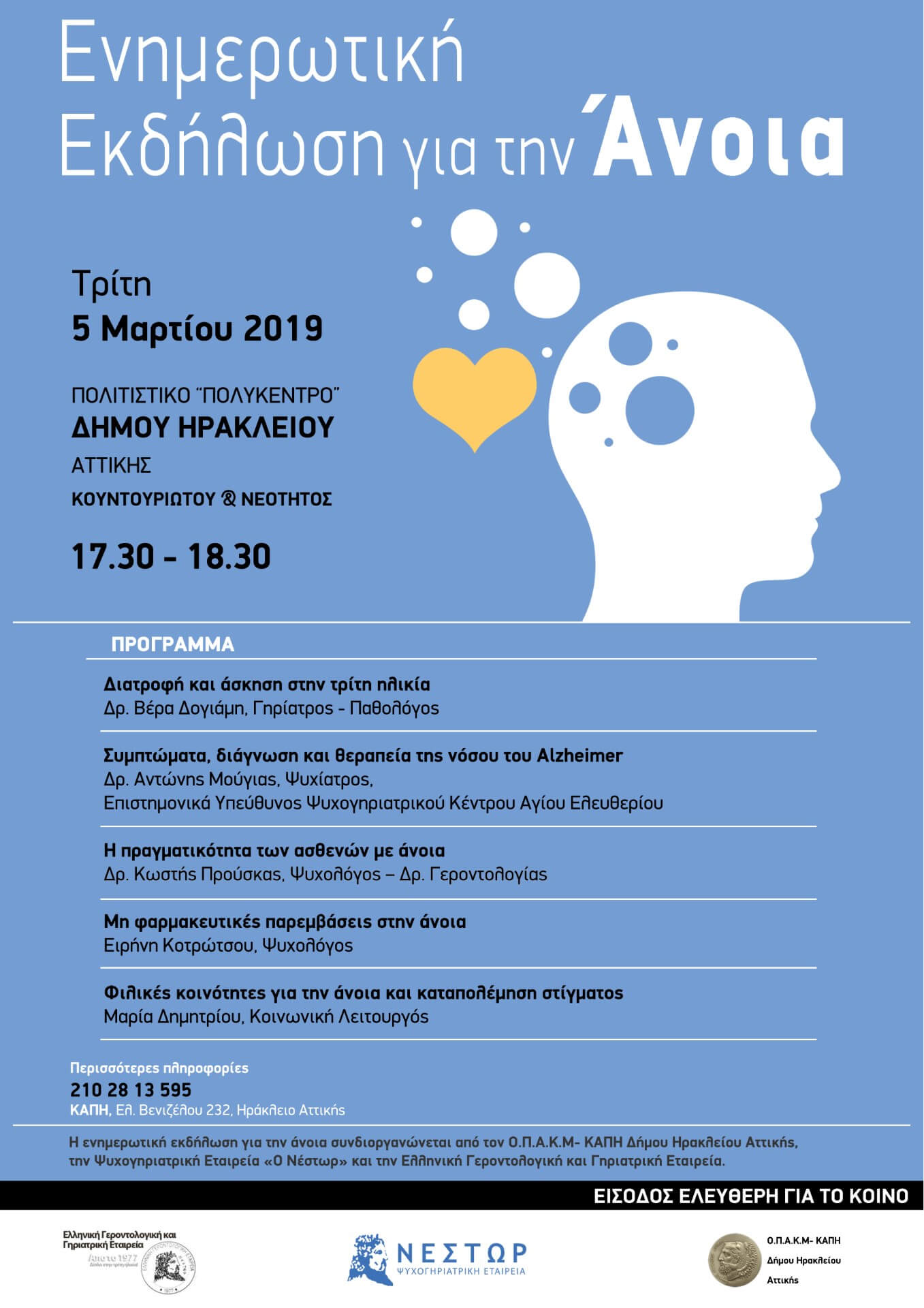 Η Ελληνική Γεροντολογική και Γηριατρική Εταιρεία διοργανώνει ημερίδα με θέμα «Πρόληψη, Προαγωγή Υγείας και Φροντίδα των ηλικιωμένων», στο πλαίσιο του Εθνικού Πιλοτικού Προγράμματος ΗΠΙΟΝΗ, την Πέμπτη 7 Μαρτίου 2019, 09:00 – 14:30 στο Κέντρο Κοινωνικής Πρόνοιας Περιφέρειας Αττικής (Τσόχα 5, Αμπελόκηποι, Αθήνα).