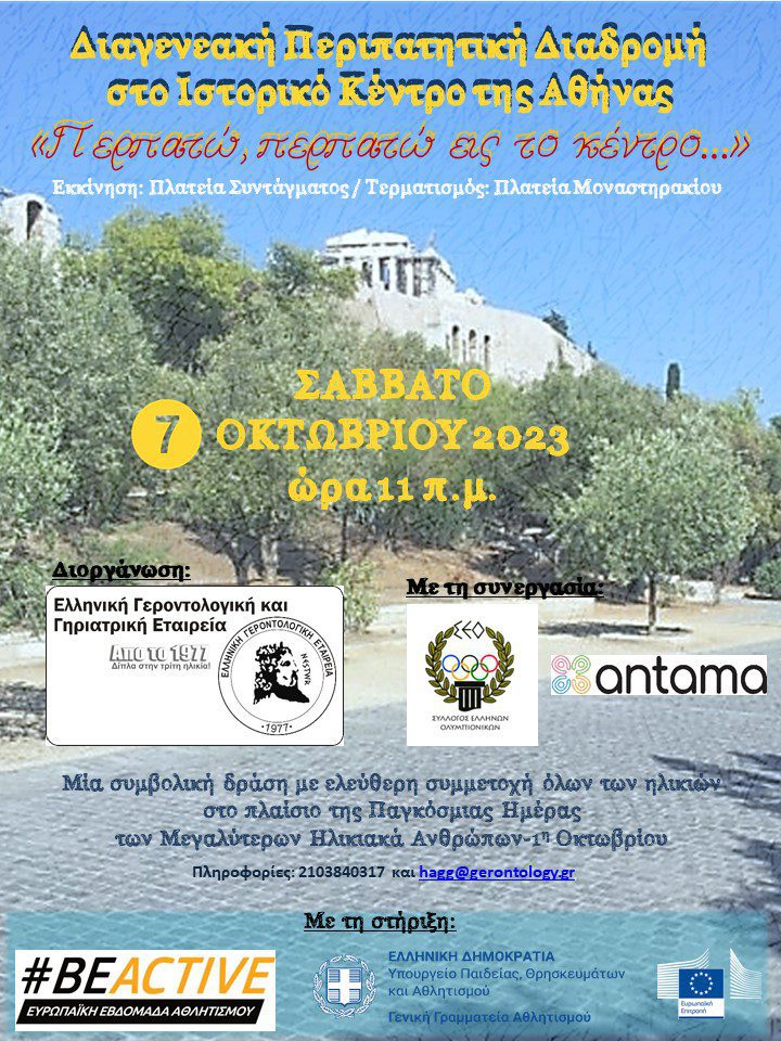 Η Ελληνική Γεροντολογική και Γηριατρική Εταιρεία σε συνεργασία με τον Σύλλογο Ελλήνων Ολυμπιονικών, την κοινωνική οργάνωση για την τρίτη ηλικία ΑΝΤΑΜΑ και με τη στήριξη του ευρωπαϊκού προγράμματος #BEACTIVE που εκπονεί η Γενική Γραμματεία Αθλητισμού μέσω των δράσεων #BeActiveHellas, πραγματοποιούν με την ευκαιρία της Παγκόσμιας Ημέρας των Μεγαλύτερων Ηλικιακά Ανθρώπων-1η Οκτωβρίου, το Σάββατο 7 Οκτωβρίου 2023 στις 11 το πρωί τη δράση: